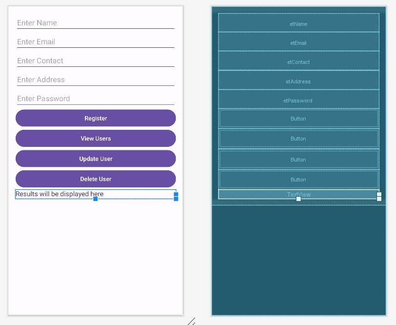 The following android program demonstrate how SQLite is implemented in android studio. In this example, we demonstrate the CRUD (Create Read Update Delete) operations. First, design the form (activity_main.xml)